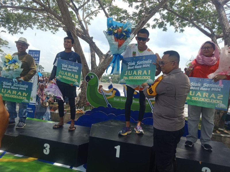 SIAK - TIm Dayung Podsi Kabupaten Bekasi berhasil menjadi juara pada ajang Siak Serindit Boat Race (SSBR) tahun 2024, Sabtu (31/8) sore