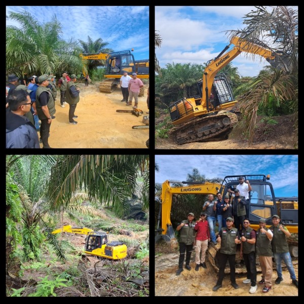 Pada kesempatan tersebut juga langsung dilakukan pemusnahan kebun kelapa sawit milik NS dengan menggunakan alat berat Eskavator dengan cara di tumbang dan dicabut, yang selanjutnya akan segera dilakukan penanaman pohon kayu untuk pemulihan fungsi Hutan Konservasi Taman Nasional Tesso Nilo. (Sam)